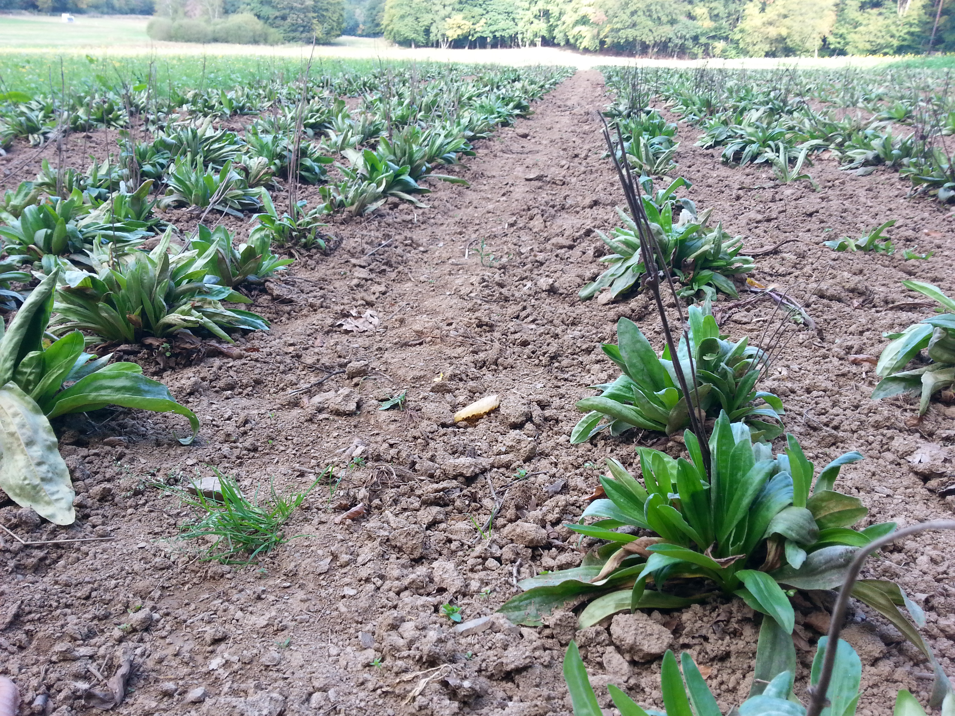 Die Arnica-Blüten waren auch schon geerntet. Die Pflanze wird vorgezogen und bei ausreichender Größe gepflanzt, daher die Anordnugn in Reihe.