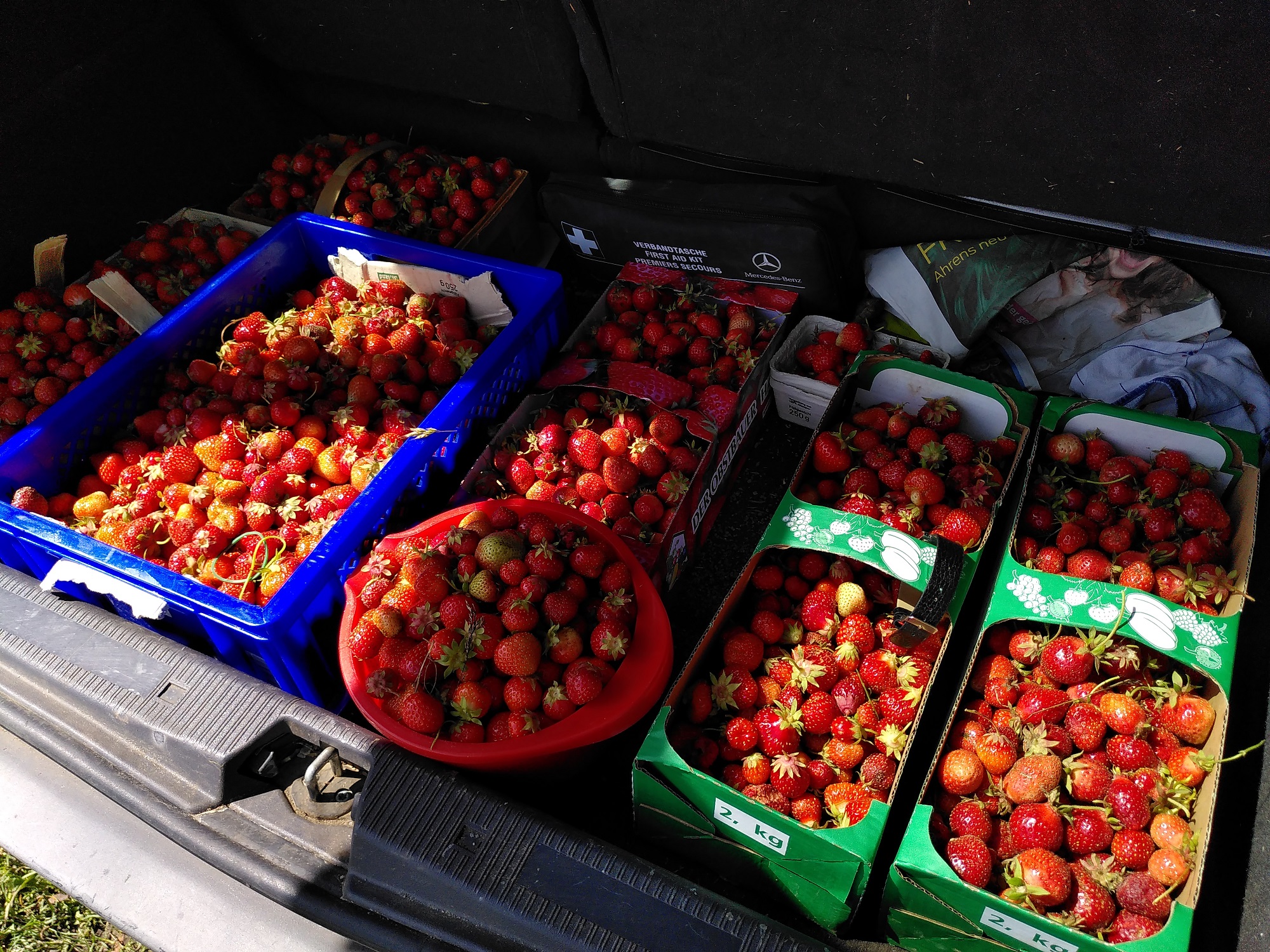 Am frühen Samstagmorgen machten sich zwei Marburgerinnen auf zum Hof Grünzeug nach Krchvers um das Erdbeerfeld nachzuernten. Uwe teilte uns mit, dass die Erdbeeren sehr wahrscheinlich recht klein sein würden. Tatsächlich waren aber auch ein paar größere dabei (die sich allerdings gut in Disteln und Brennesseln versteckten), sodass wir nach etwas über drei Stunden und krummen Rücken fast 20 kg zusammen hatten.