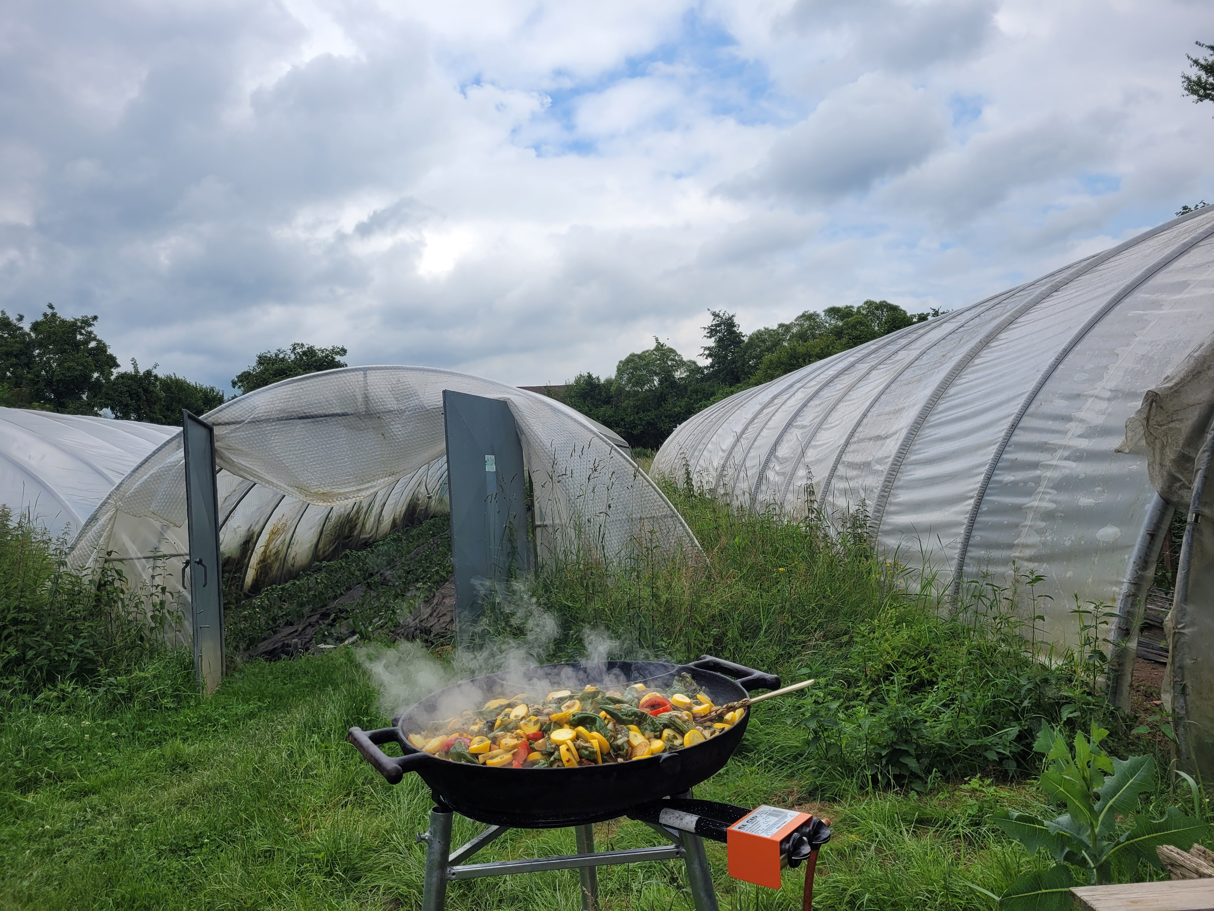 Obwohl Ackereinsätze immer schön sind, gibt es für die Teilnehmenden manchmal auch noch eine besondere Überraschung - so wie am Samstag, 22.6. Da kamen wir in den Genuss des ersten Solawi-Sommer-Essens. Denn die allerersten Zucchinis und Bratpaprikas sind reif, reichen aber noch nicht für alle zum Verteilen. Daher haben wir beides zusammen mit Zwiebeln, Frühlingszwiebeln und Zuckererbsen in eine große Paellapfanne geworfen, über der Gasflamme gebraten und anschließend verspeist: