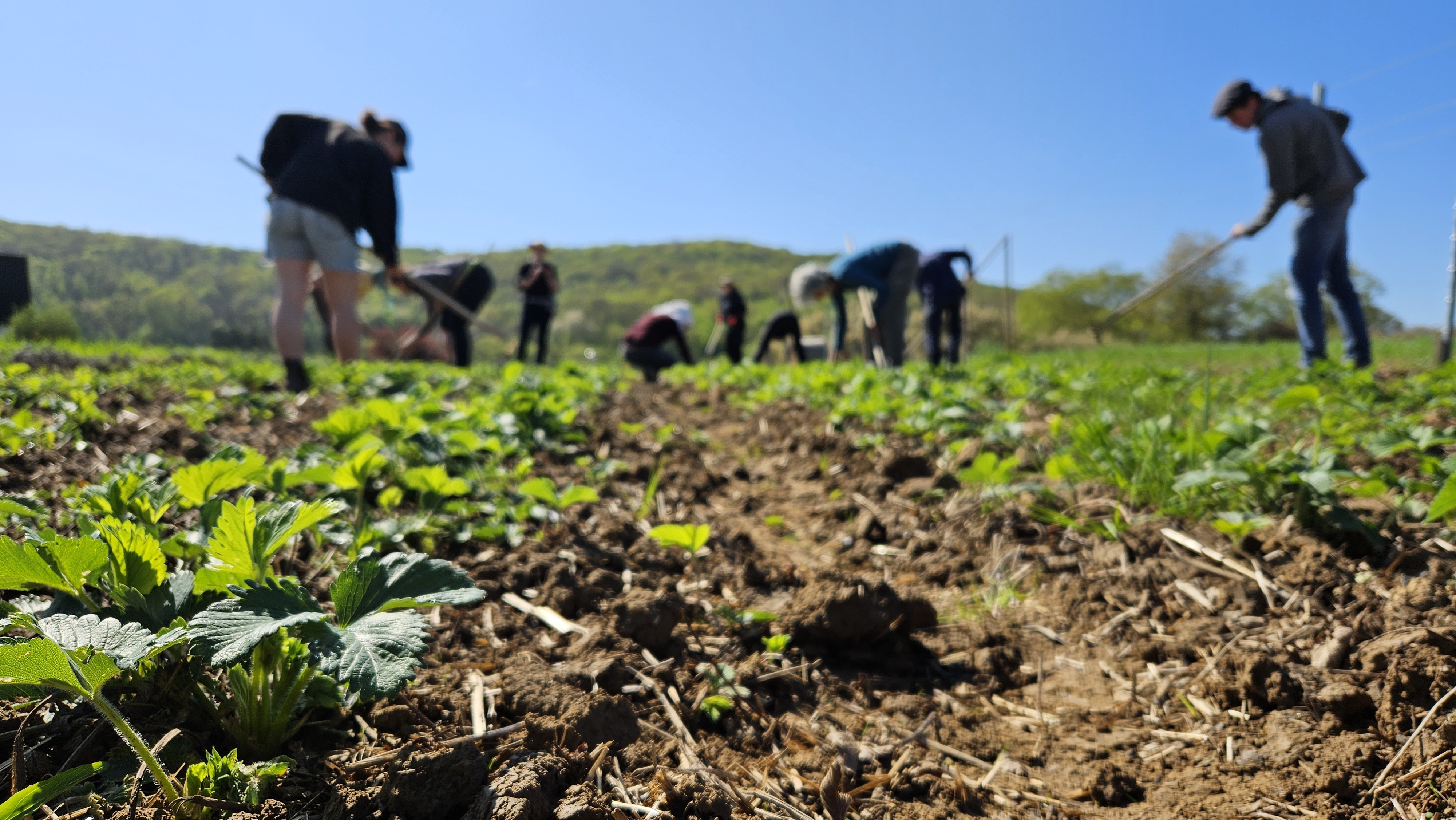 Das bisschen Klee am Beginn der Reihen war schnell weggehackt. Aber je weiter wir in den vorderen Teil vordrangen, desto häufiger wurde ein anderes Beikraut, nämlich der Hahnenfuß. Der hat die unangenehme Eigenschaft, gern direkt an der Erdbeerpflanze zu wachsen, sodass wir manchmal beides ausgraben, mühsam voneinander trennen und die Erdbeerpflanze wieder eingraben mussten. So kamen wir, obwohl insgesamt 12 Mitglieder dabei waren, nur sehr langsam voran. Zum Glück gab es zwischendurch Mittagessen: Asia-Pfanne aus Pastinaken, Pak Choi und Lauch, dazu Reis. Ein paar Mitglieder waren auch danach noch motiviert und haben etwa eine Stunde weiter gehackt. Weil das mit dem Hahnenfuß aber immer noch so lang dauerte, haben wir den Erdbeeracker leider nur zu etwa drei Vierteln fertigbekommen. Trotzdem waren sich alle einig, dass es bei dem schönen Wetter und der tollen Landschaft fast keine schönere Beschäftigung hätte geben können!