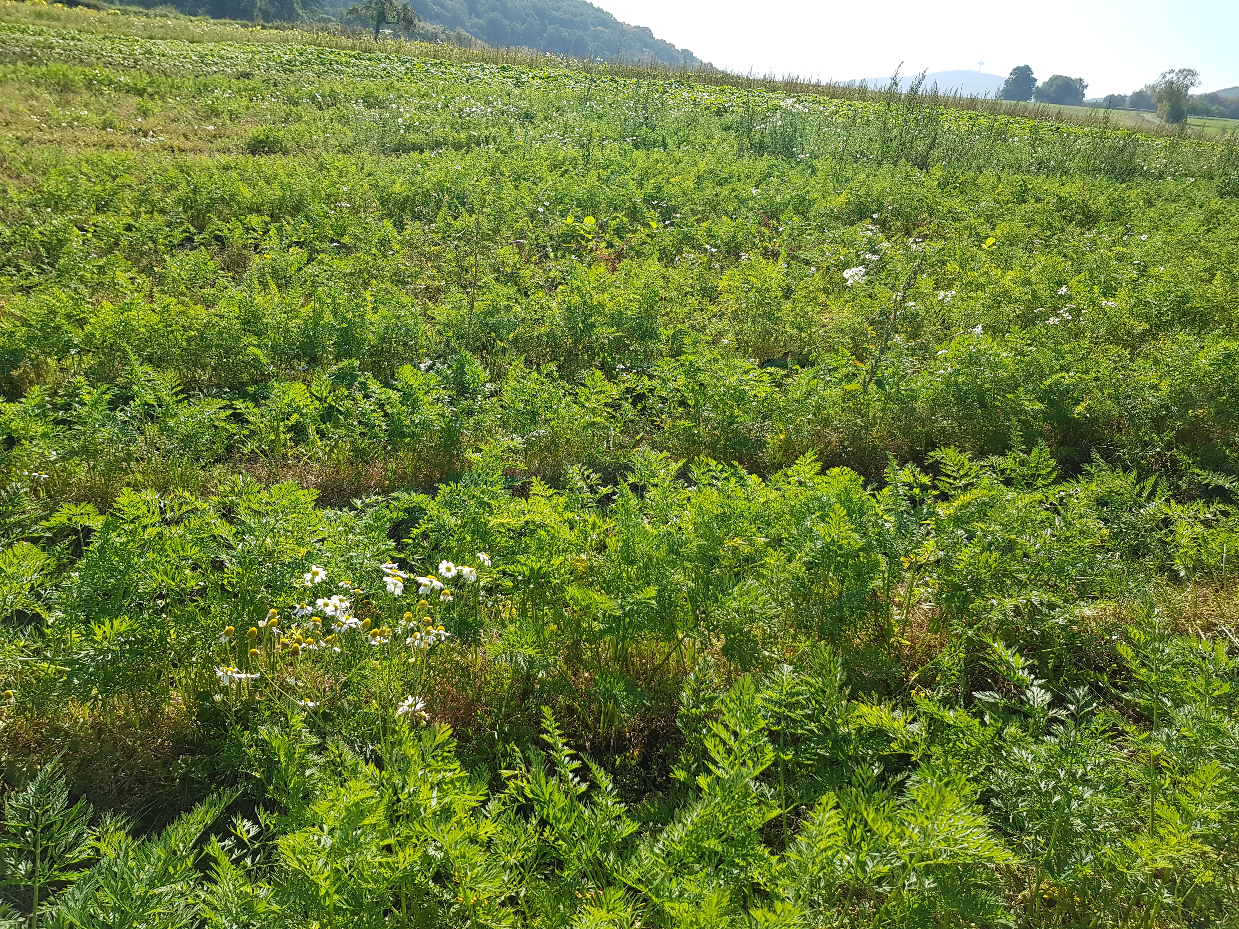 Der auf den 9.10. verschobene Ackereinsatz konnte mit 5 Mitgliedern bei strahlendem Sonnenschein stattfinden. Zuerst haben wir Nachernte betrieben: Beim Weißkohl und beim Wirsing war allerdings nicht mehr besonders viel zu holen. Auch beim Kürbis gab es hauptsächlich sehr kleine Exemplare zu ernten. Dafür erinnerte das Aufspüren der kleinen gelb und orange leuchtenden Hokkaidos ein bisschen ans Ostereier-Suchen. Der Grund dafür, dass die Kürbispflanzen so im Unkraut versunken sind, ist der, dass es gerade in der Zeit, als sie gepflanzt wurden, ziemlich kalt war. Das mag der Kürbis gar nicht, während es den Beikräutern nicht so viel ausmacht. Und auch die Möhren waren zum Teil nicht so groß, wie sie sein könnten. Das immer kleiner werdende Möhrengrün im Hintergrund des Bildes unten verdeutlicht noch mal, dass manche Reihen vermutlich gar keinen nennenswerten Ertrag bringen werden. Spaß gemacht hat das Ernten trotzdem und wir konnten bergeweise kleine oder kaputte Möhren sowie Kürbisse mitnehmen!