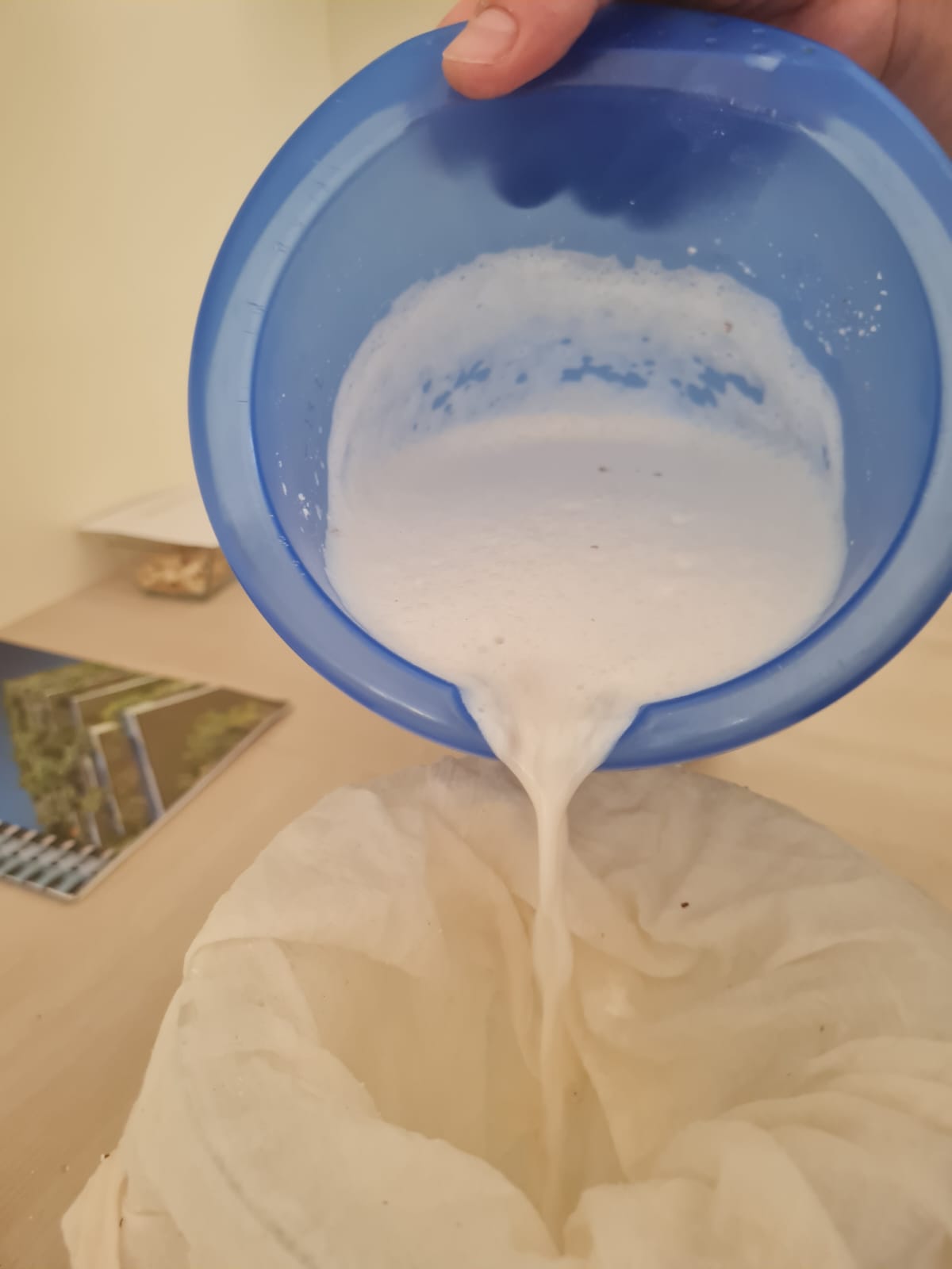 Milchalternativen kann man nicht nur käuflich erwerben, man kann sie auch selbst herstellen. Und das haben wir bei unserer gemeinsamen Mitmachaktion am 26.06.2023 in der Küche der FBS in Marburg mit zwei verschieden Gruppen ausprobiert. Wir haben Hafermilch, Mandelmilch und Haselnussmilch selbst gemacht. Die eigene Herstellung ist sehr einfach und erfordert nur wenige Geräte und Zutaten. Man braucht nur einen Mixer, ein Nussmilchtuch, sowie Wasser, eine Prise Salz und eine bestimmte Menge der Grundzutat, aus welcher die Milchalternative hergestellt werden soll. Bei der Zubereitung werden alle Zutaten gemixt, bis eine homogene Masse entsteht, welche anschließend mithilfe des Nussmilchtuches gefiltert wird. Ist dieser Vorgang abgeschlossen, kann die Flüssigkeit in Flaschen abgefüllt werden. Die selbsthergestellten Milchalternativen sind ca. 4 Tage im Kühlschrank haltbar und können sowohl pur zum Trinken, im Kaffee oder im Müsli als auch zum Kochen und Backen verwendet werden. Die Teilnehmer:innen unserer Mitmachaktion hatten sehr unterschiedliche geschmackliche Präferenzen, aber insgesamt wurde die Haselnussmilch im Verlauf des Abends am öftesten positiv hervorgehoben. Weil alle großen Hunger zu unserer Mitmachaktion mitgebracht hatten, haben wir nicht nur pflanzliche Milchalternativen, sondern auch Nudeln mit einer veganen „Käsesoße“ und veganen „Parmesan“ zubereitet und anschließend gemeinsam gegessen und den Abend gemütlich ausklingen lassen.