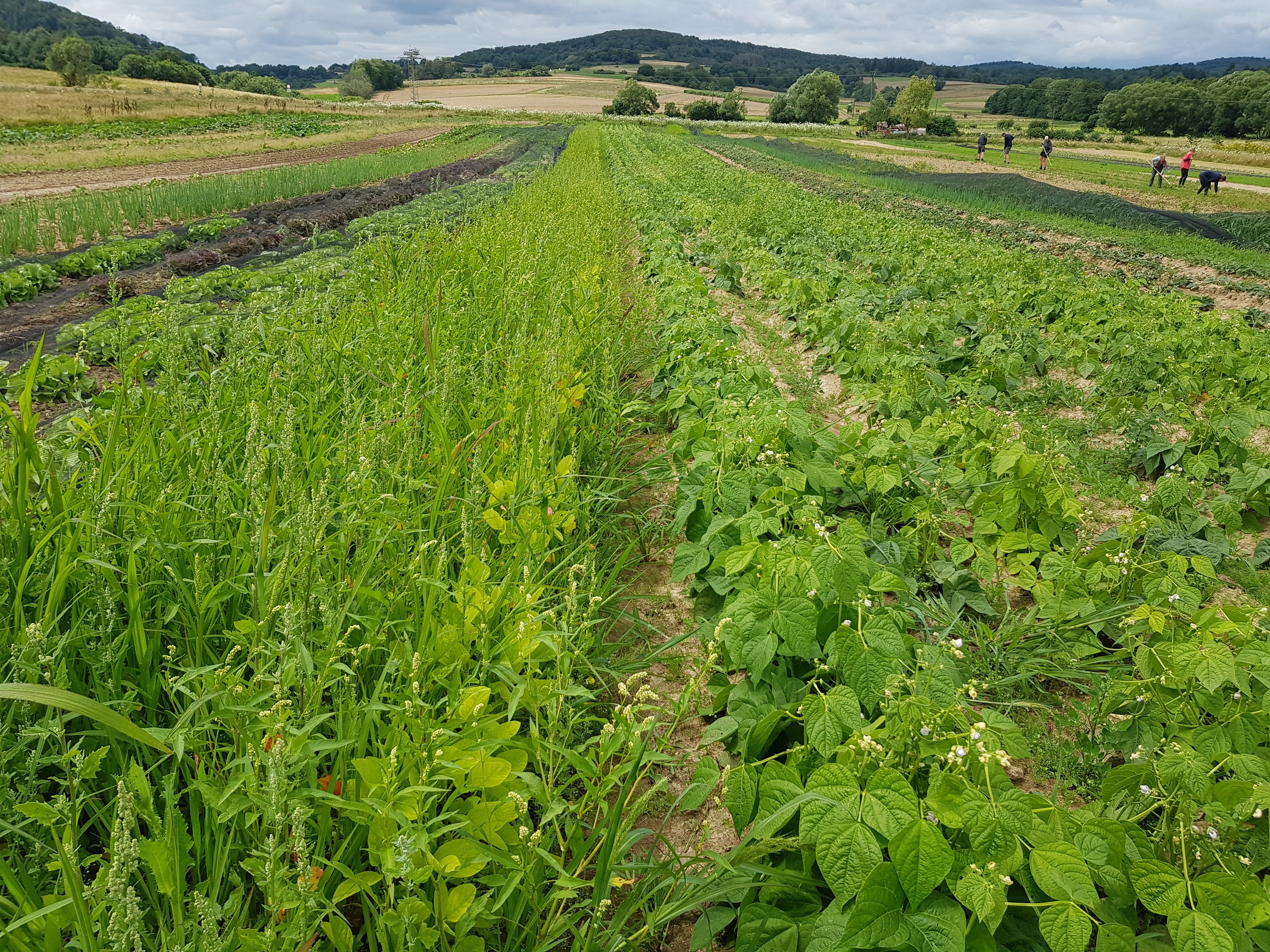 Wie an jedem letzten Samstag im Monat von April bis Oktober kam eine Handvoll Mitglieder - in diesem Fall: 10 an der Zahl - nach Kirchvers und übte sich in Feldarbeit. In der aktuellen Jahreszeit heißt die Disziplin weiterhin: Hacken. Und zwar bei zwei der wichtigsten Kulturen für das Winterlager: Lauch und Möhren. Von beiden gibt es auf den Kirchverser Äckern lange Reihen, und bei den Möhren hatte sich auf halber Höhe der Reihe eine Schlammkuhle gebildet. Hier das Gras und weitere Beikräuter zu entfernen, glich einer Schlammschlacht, sodass wir uns letztlich auf trockenere Gebiete beschränkten. Aber auch da gab es noch reichlich zu tun. Auch von kleineren Unglücken wie einem platten Reifen ließen sich die mit dem Fahrrad Angereisten nicht lange beirren - Uwes Fahrradwerkstatt sei Dank! Am Ende durften alle Teilnehmenden bei den Zucchinis, den Gurken, den Beten und dem Mangold vorbeischauen und etwas für zu Hause ernten.