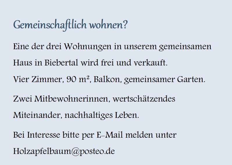 Name: Brigitte (Holzapfelbaum@posteo.de)Rubrik: Biete Zimmer/ WohnungDetails siehe Bild Auf Kleinanzeige antworten