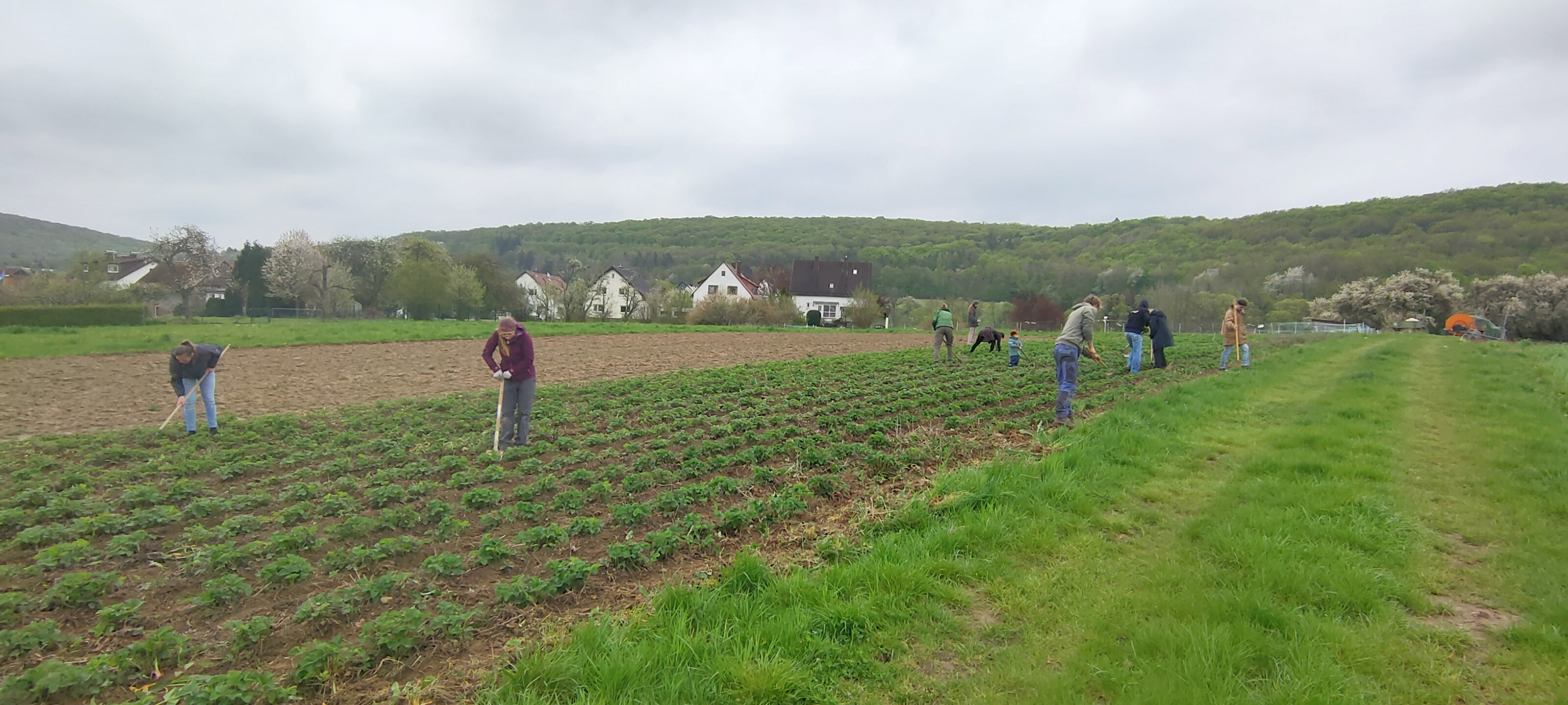 Viele helfende Hände nehmen sich den Erdbeeracker vor.   Hier fehlt nur noch eine kleine Ecke.   Und hier sind wir fertig - zwischen den Erdbeer-Reihen ist überall ist Stroh verteilt.