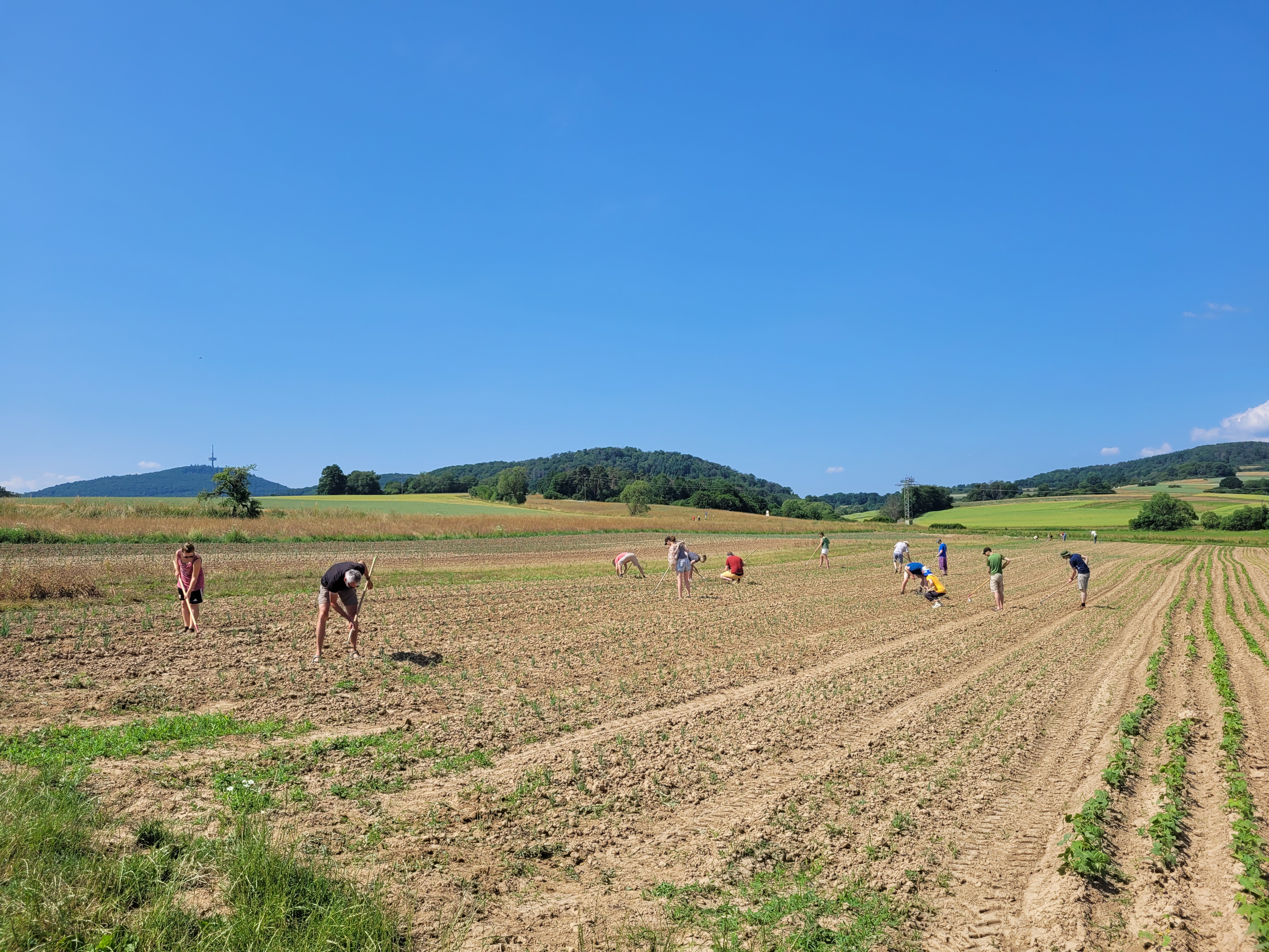 Dass die auf dem Hof vorhandenen Werkzeuge nicht ausreichen, das gibt's nicht so oft bei uns! Am 24.6. waren so viele motivierte Mitglieder, darunter viele Kinder, plus 5 Radler*innen vom Zukunftsforum Gladenbach auf dem Acker, dass wir kurz überlegen mussten, wie wir die Geräte zum Hacken verteilen: