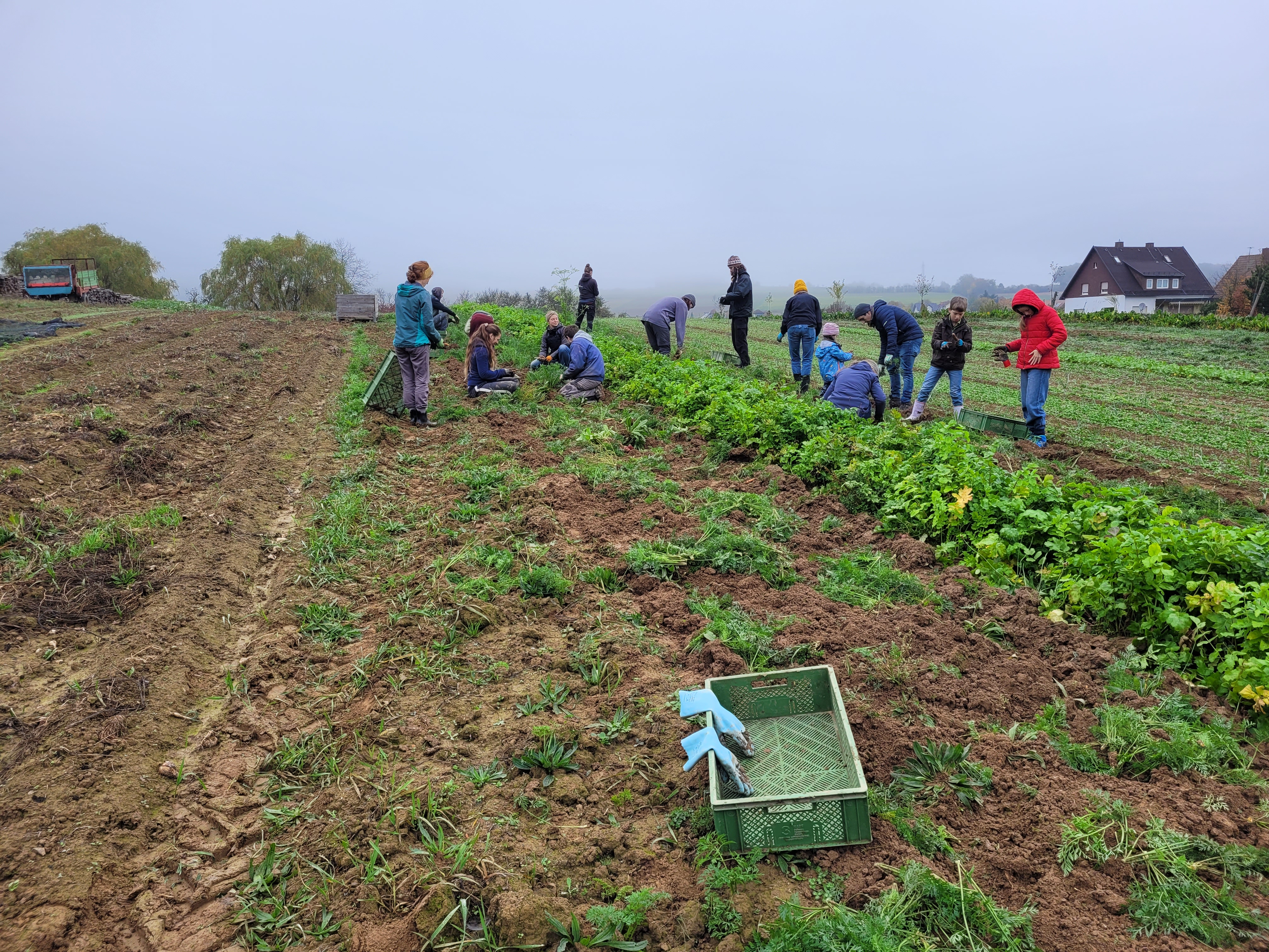Beim letzten Ackereinsatz des Jahres (am 26.10.24) kamen besonders viele Mitglieder zusammen und halfen bei der Ernte von Möhren, Schwarzem Rettich und Pastinaken. An die 20 Personen tummelten sich auf dem Acker, der leider ziemlich matschig war:
