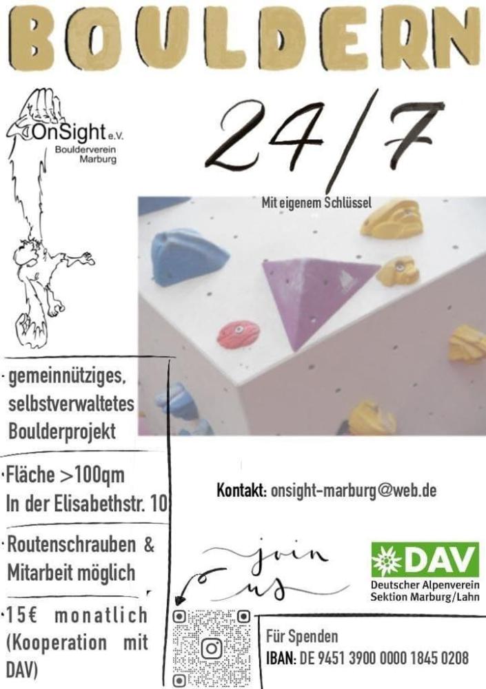 Im Zentrum von Marburg (Elisabethstr 10.) entsteht gerade ein nicht kommerzieller Ort zum gemeinsamen Bouldern. Die Gestaltungsmöglichkeiten sind dabei vielfältig, vom Aufbau der Boulderwände, über das Schrauben von Kletterrouten, bis hin zur Organisation der Mitglieder. Durch das Engagement viele Einzelner, liegt der monatliche Mitgliedsbeitrag bei nur 15€ und alle bekommen einen eigenen Schlüssel um 24/7 Zugang zu erhalten. Aktuell bauen wir mit viel Spaß an unseren Boulderwänden, wir rechnen aber damit, dass im Mai der erste Bereich schon zum Bouldern fertig gestellt ist und der restliche Ausbau dann Schritt für Schritt folgen wird. Folgt uns auf Telegram und Insta. Meldet euch auch gern, wenn ihr noch keine Erfahrung mit dem Bouldern/Klettern habt, oder ihr euch die 15€ nicht leisten könnt.